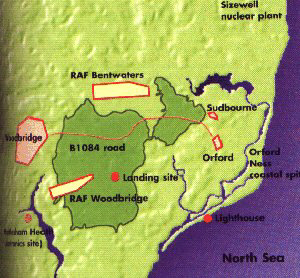 RAF, namely RAF/U.S.A.F Bentwaters and RAF/U.S.A.F Woodbridge were leased to the U.S. Air Force and reputedly held the largest stockpile of tactical nuclear weapons in non-communist Europe. Woodbridge was also the home of the 67th Aerospace Rescue and Recovery Squadron - a unit that reported directly to the U.S. Department of Defense in Washington. At approximately 2-00a.m. on the 27th December 1980,an unidentified object was picked up by radar at RAF Watton in Norfolk (UK). The object went off the screen in the area of Rendlesham Forest in Suffolk. RAF/U.S.A.F Bentwaters also tracked the unidentified object - Bentwaters being in the direct vicinity of Rendlesham Forest. At approximately 3-00a.m. two U.S.A.F security guards observed unusual lights outside the back gate of RAF Woodbridge and three patrolmen were sent to investigate. These three men reported seeing a strange , glowing object seemingly of metallic appearance and of a triangular shape. They reported it being approximately two to three meters across the base and two meters tall, giving off a bright white light which illuminated the entire forest. Also it had a pulsing red light on top and a bank of blue lights underneath - it was hovering but apparently had legs. When the men approached the object it maneuvered through the forest and out of view, to be briefly seen again an hour or so later near the back gate. |
